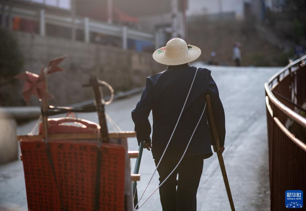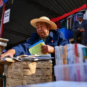 4月19日,李存德拉着车前往农家书屋装书,准备出摊。新华社记者 江文耀 摄