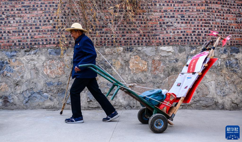 4月19日,李存德拉着车前往农家书屋装书,准备出摊。新华社记者 江文耀 摄