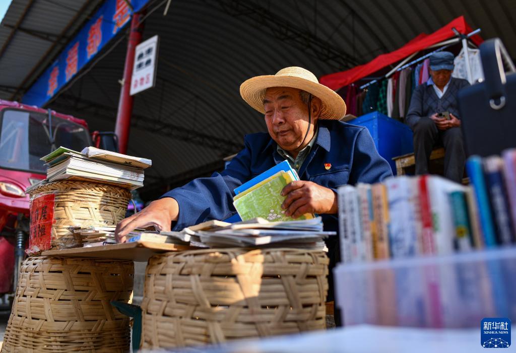4月19日,李存德在红星村的爱心流动书摊整理书籍。新华社记者 江文耀 摄