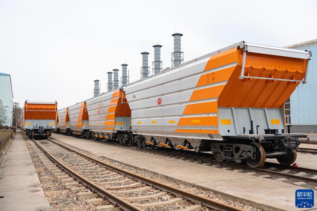 这是4月19日在中车齐车公司厂区拍摄的由该公司生产的煤炭漏斗车。