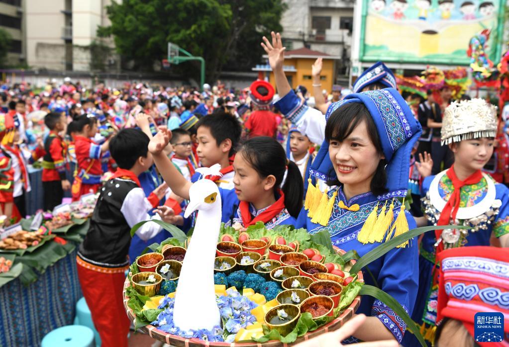当日,广西南宁市逸夫小学举行2023“壮族三月三”暨“铸牢中华民族共同体意识”主题教育活动。色彩缤纷的民族服装,民族风情浓郁的歌舞表演,多种多样的特色美食,让校园处处洋溢着欢乐。随着传统节日“壮族三月三”临近,广西各地陆续开展丰富多彩的庆祝活动。