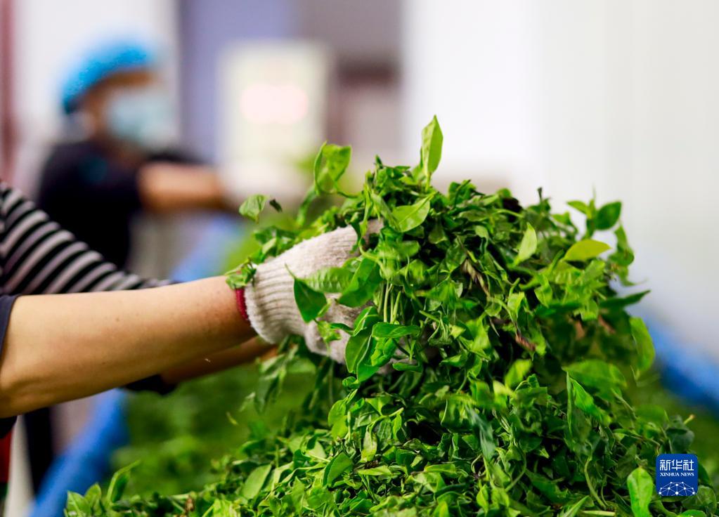 4月18日,重庆市南川区德隆镇千年金山红古树茶的生产车间内,工作人员在将鲜茶叶放入簸箕内进行萎凋。
