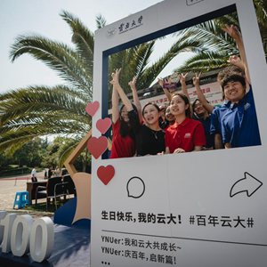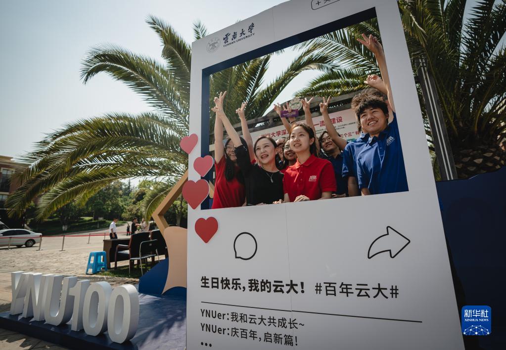 4月20日,云南大学呈贡校区师生在校庆展板处合影留念。