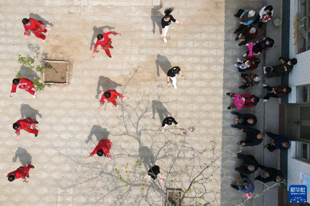 4月20日,志愿者在河北省平乡县后马康村“幸福小院”内为老人们表演节目(无人机照片)。