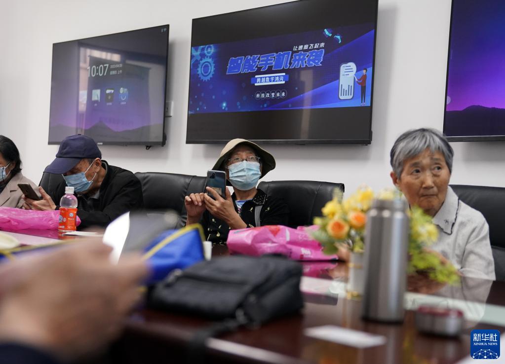 4月20日,杭州市西湖区西溪街道求智未来社区老年居民在参加智能手机培训。