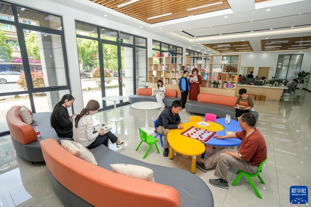 4月20日,在湖州市长兴县太湖街道新溪未来社区,社区居民在共享会客厅内进行休闲活动。