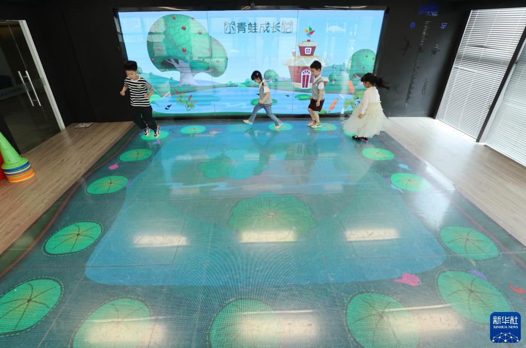 4月20日,在湖州市德清县舞阳街道玉屏未来社区,小朋友在体验智能体测游戏。
