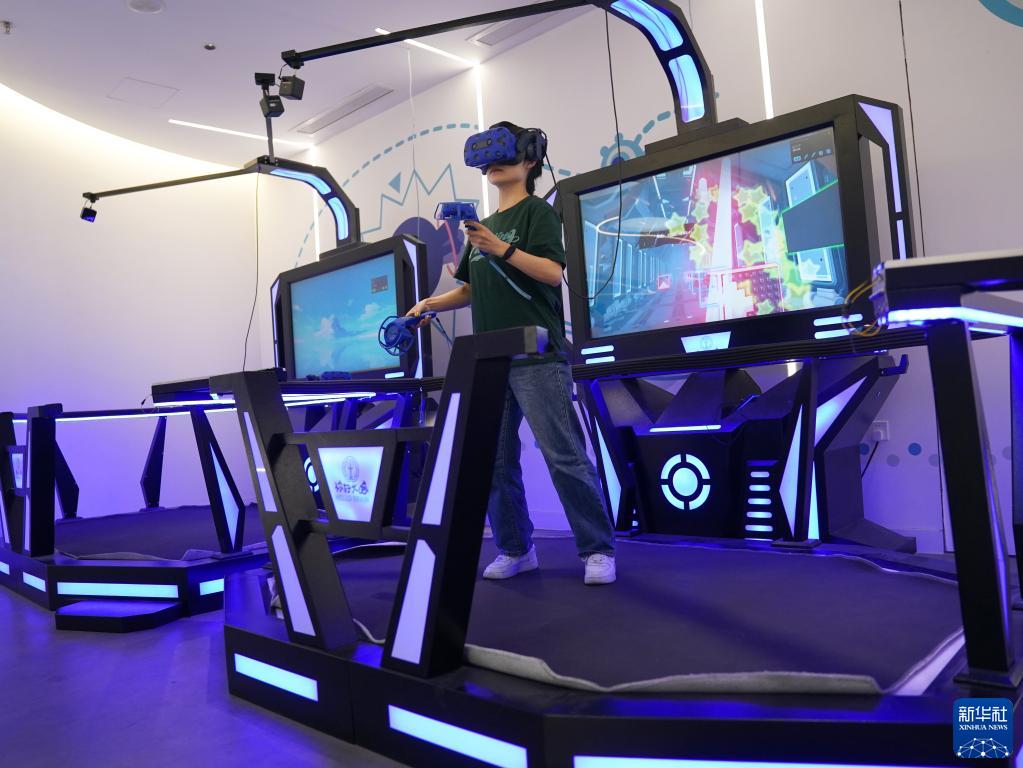 4月20日,为求智未来社区提供活动资源的周边商家、“你好大脑”体验馆工作人员演示测试青少年压力耐受能力的VR项目。