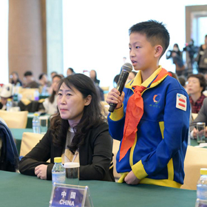 4月20日,参加活动的一名小男孩在位于北京的主会场内向航天员提问。