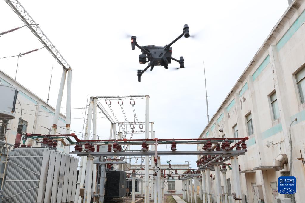 4月20日,无人机在福建平潭前进变电站附近开展自主巡检作业。