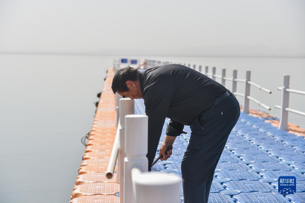 4月19日,胡登雨在对岱海的一处码头进行维修。