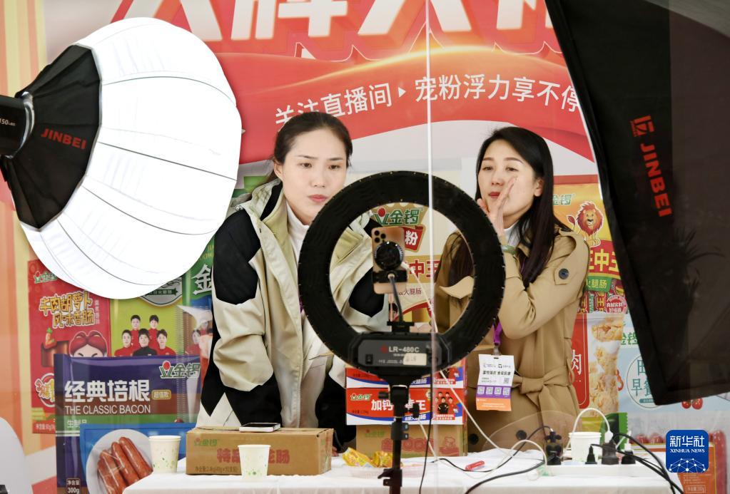 4月21日,一参展企业工作人员在展会上直播。