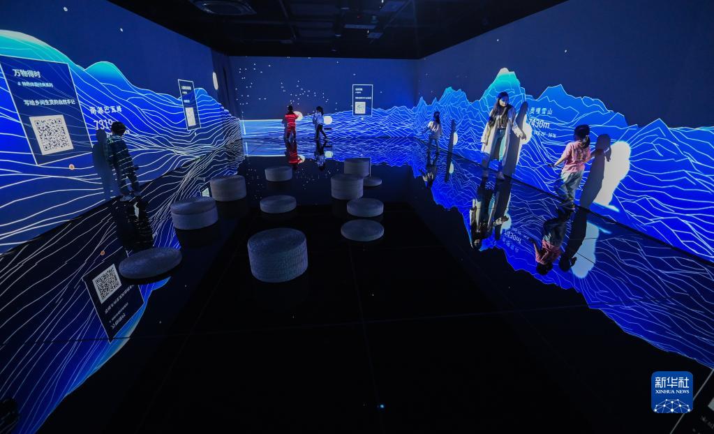 4月21日,读者在嘉兴市图书馆元宇宙阅读体验馆的自然课堂通过环幕体感投影学习各大山脉山峰的知识。