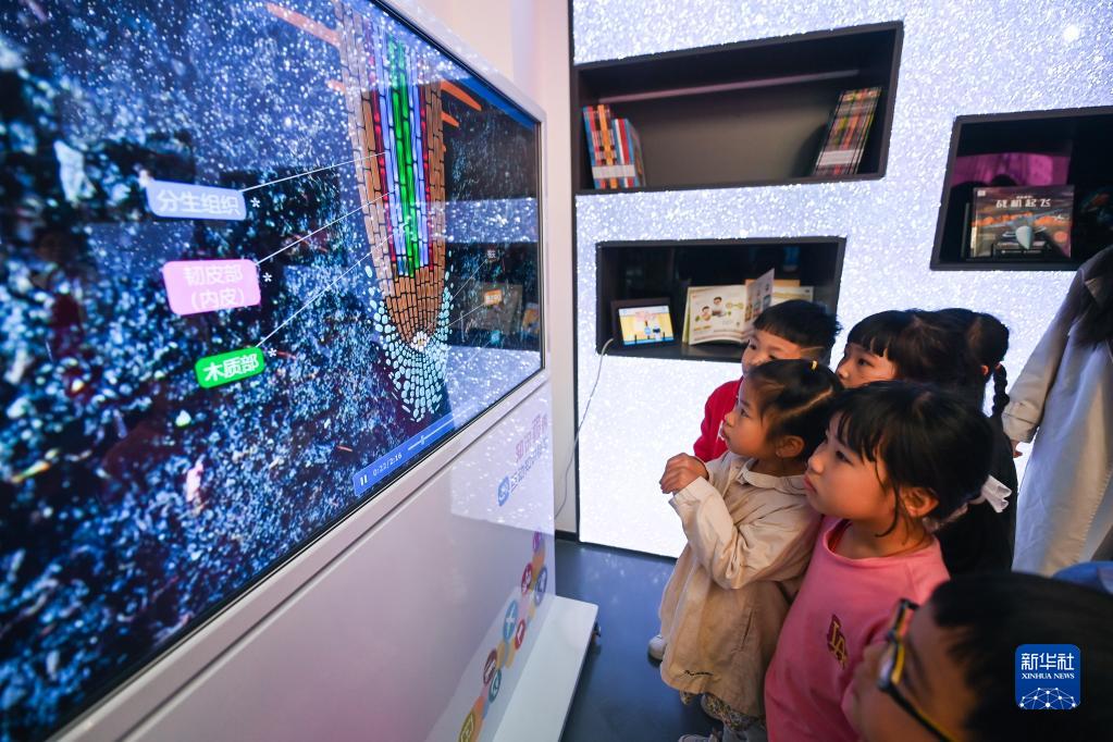 4月21日,在嘉兴市图书馆元宇宙阅读体验馆,小朋友们在老师的帮助下学习动植物知识。