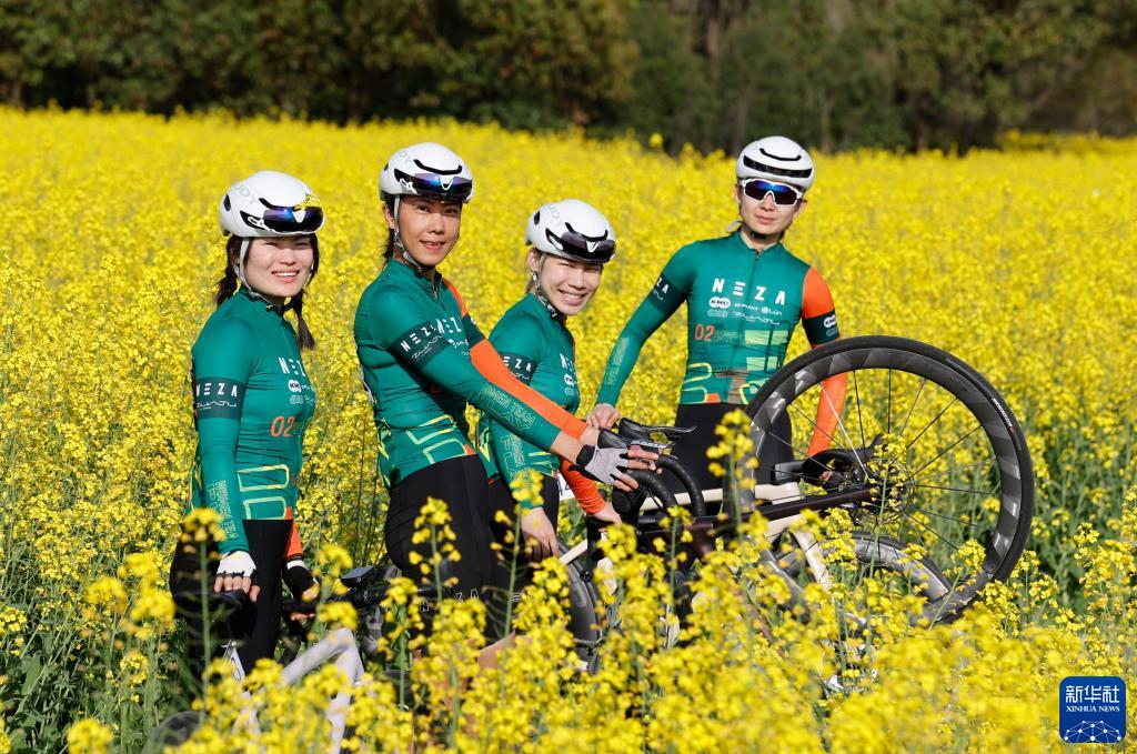 谢敏仪(左二)和队友在黟县油菜花田间合影(3月26日摄)。
