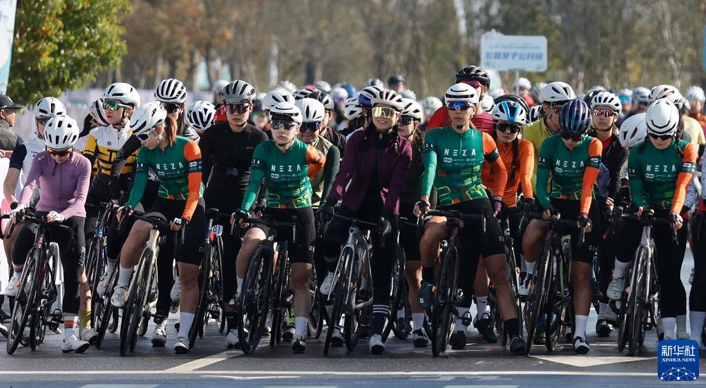 谢敏仪(前排右三)在女子公路自行车精英组比赛前准备出发(3月26日摄)。