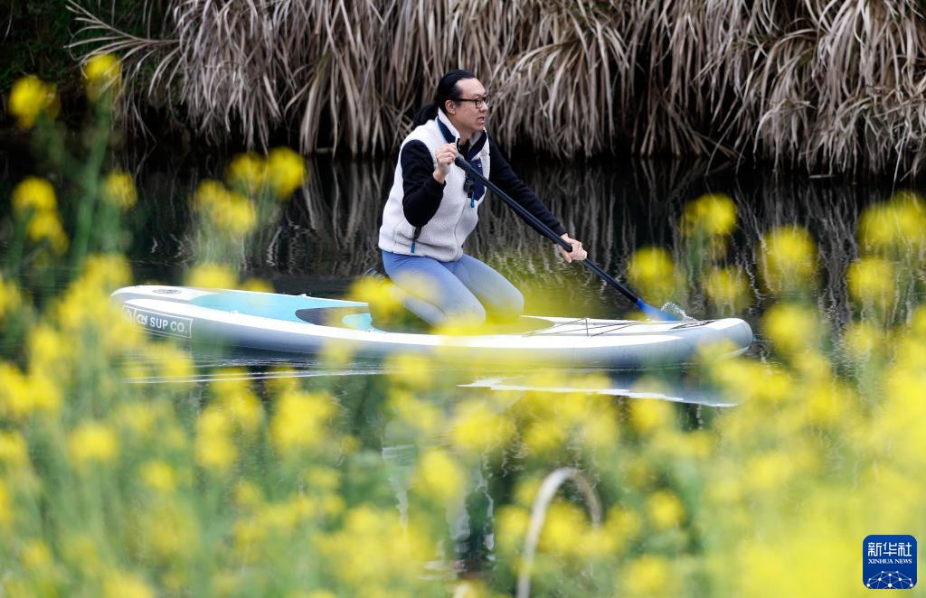 刘龙在民宿前的小河中划桨板(3月29日摄)。