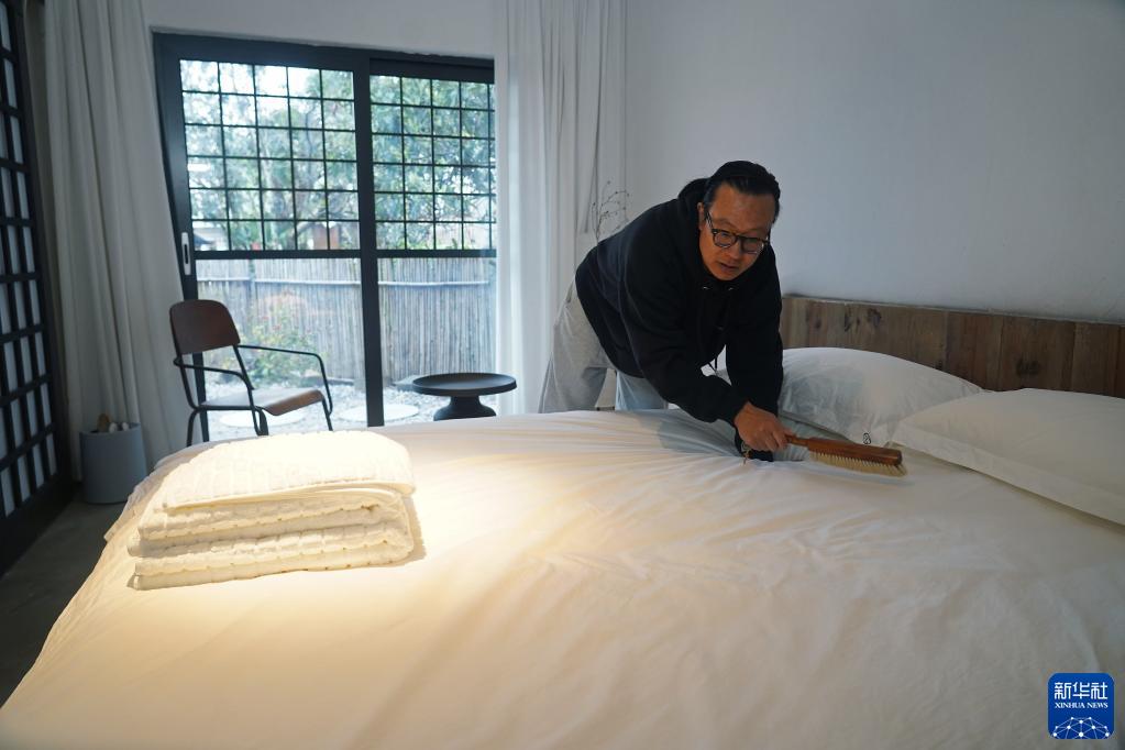 刘龙在民宿里打扫房间卫生(3月29日摄)。