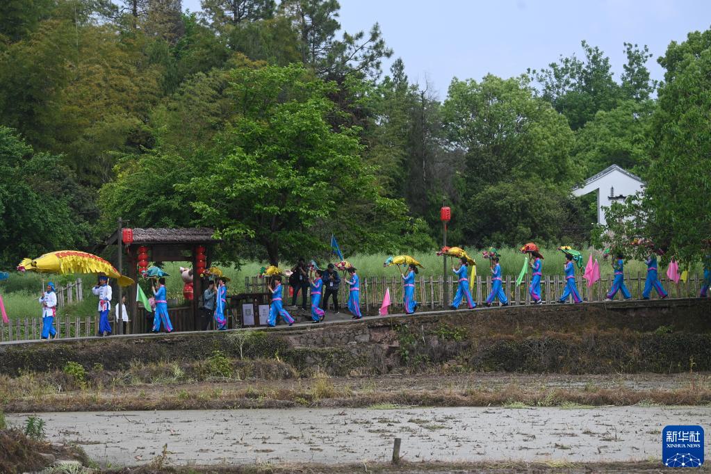 4月21日,“严州虾灯”展演队伍行走在建德市大慈岩镇新叶古村的田野中。