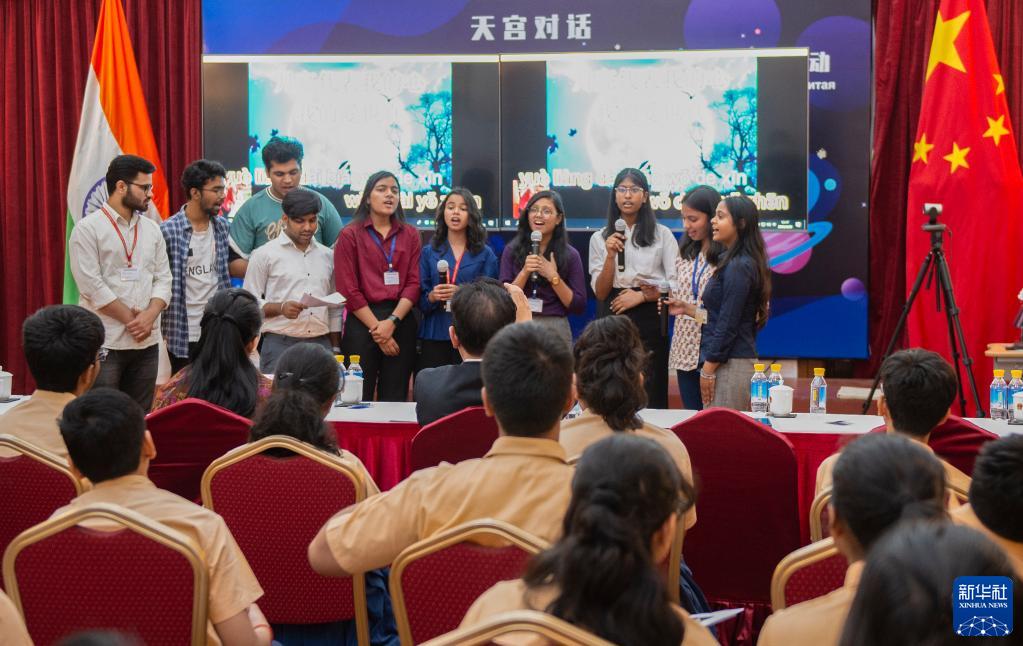 4月20日,印度青少年在位于新德里的中国驻印度大使馆参加天宫对话——神舟十五号航天员乘组与上海合作组织国家青少年问答活动时唱歌。