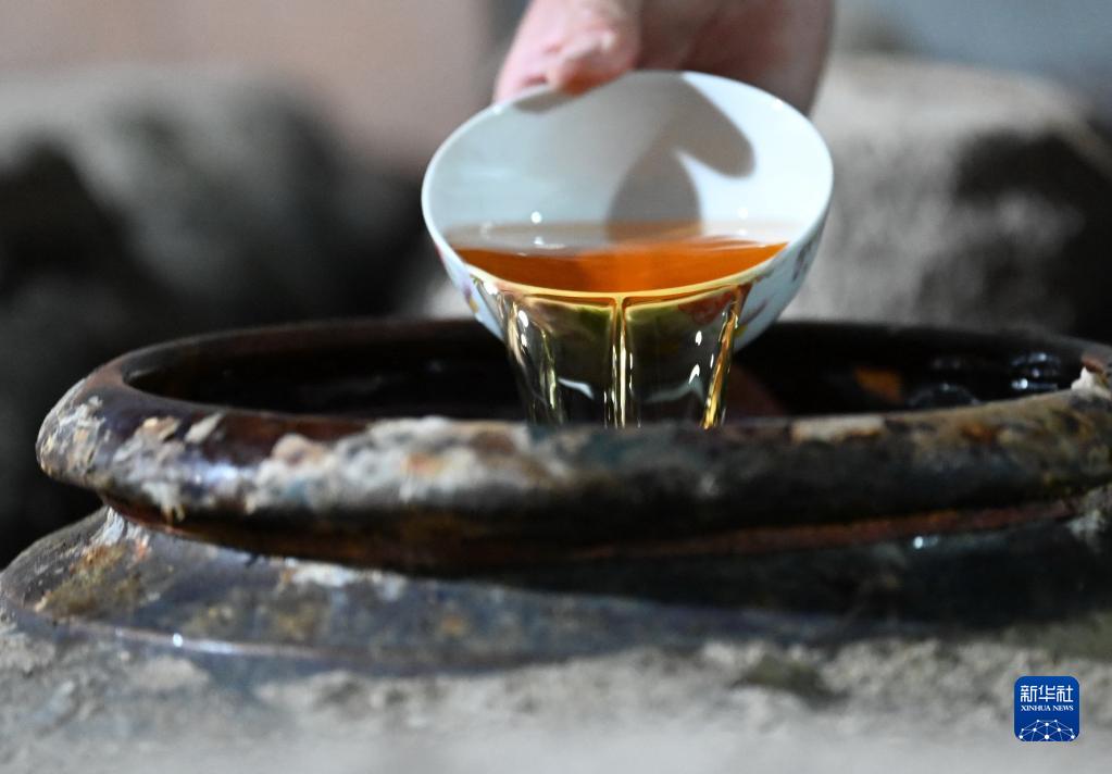 4月20日,屏南县代溪镇北墘村村民展示自己酿的黄酒。