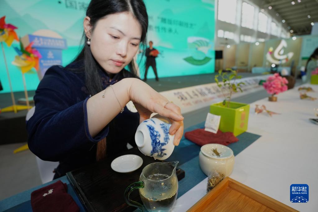 4月21日,在北京茶博会“春茶临京城 共品非遗茶”活动上,茶艺师在倒茶。