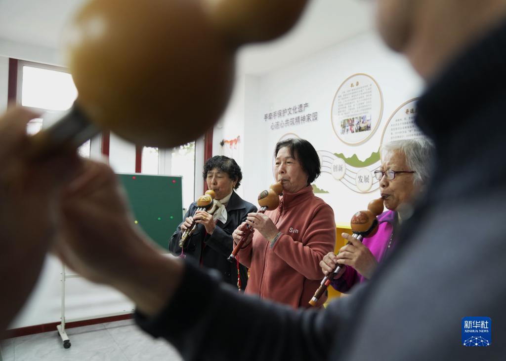 4月21日,秦皇岛市北戴河区安居社区几位老年人在日间照料服务中心练习演奏葫芦丝。
