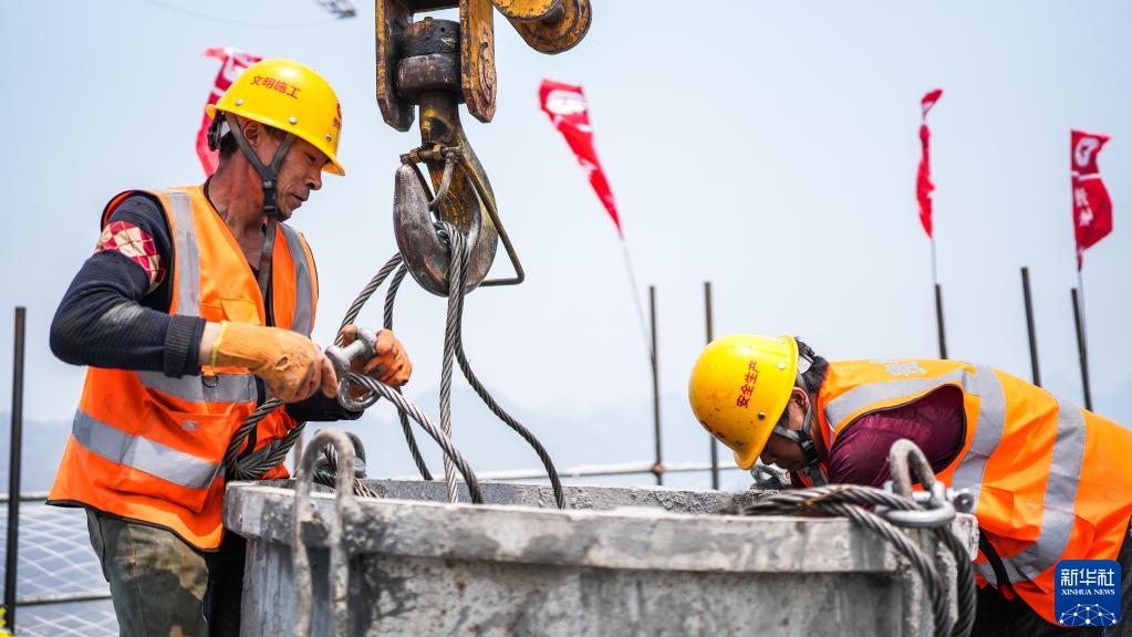 4月21日,工人在花江峡谷大桥6号主塔上进行施工。