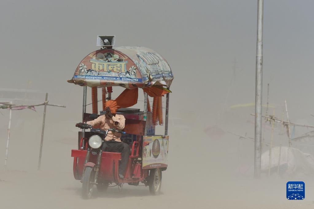 4月18日,在印度北方邦普拉亚格拉杰,一名男子冒着风沙出行。