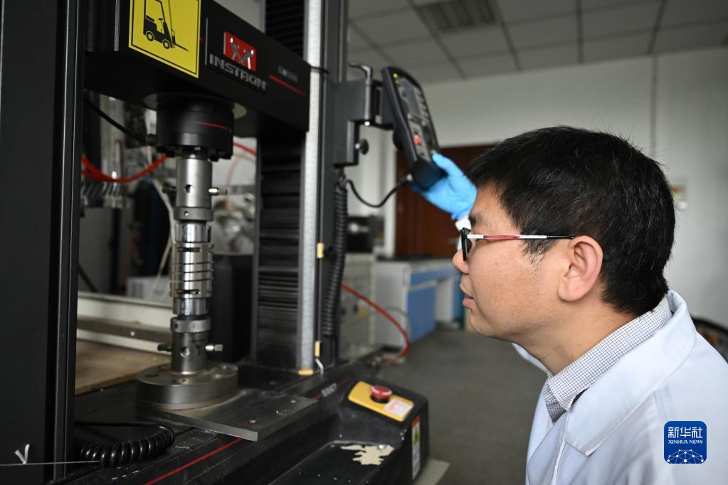 4月19日,在中科院合肥物质科学研究院,固体物理研究所内耗与固体缺陷研究部研究员蒋卫斌在测量减振弹簧的力学强度。