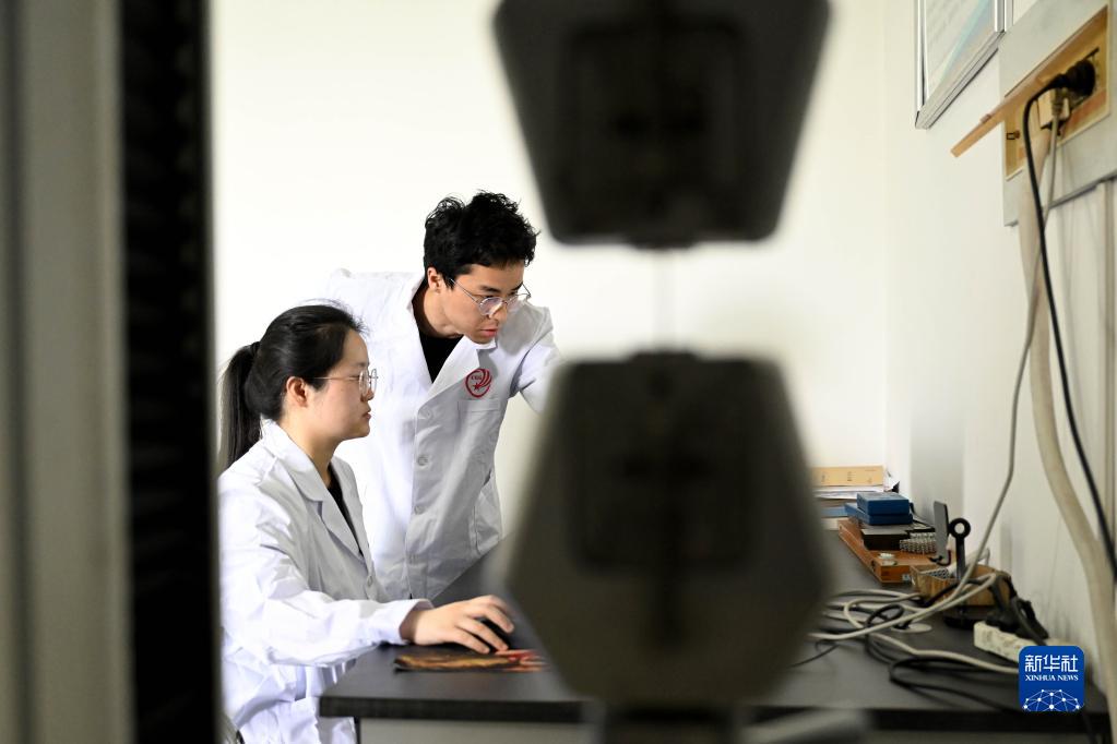 4月19日,在中科院合肥物质科学研究院,固体物理研究所特种航天金属材料研究团队的学生在测试“嫦娥钢”材料的拉伸性能。