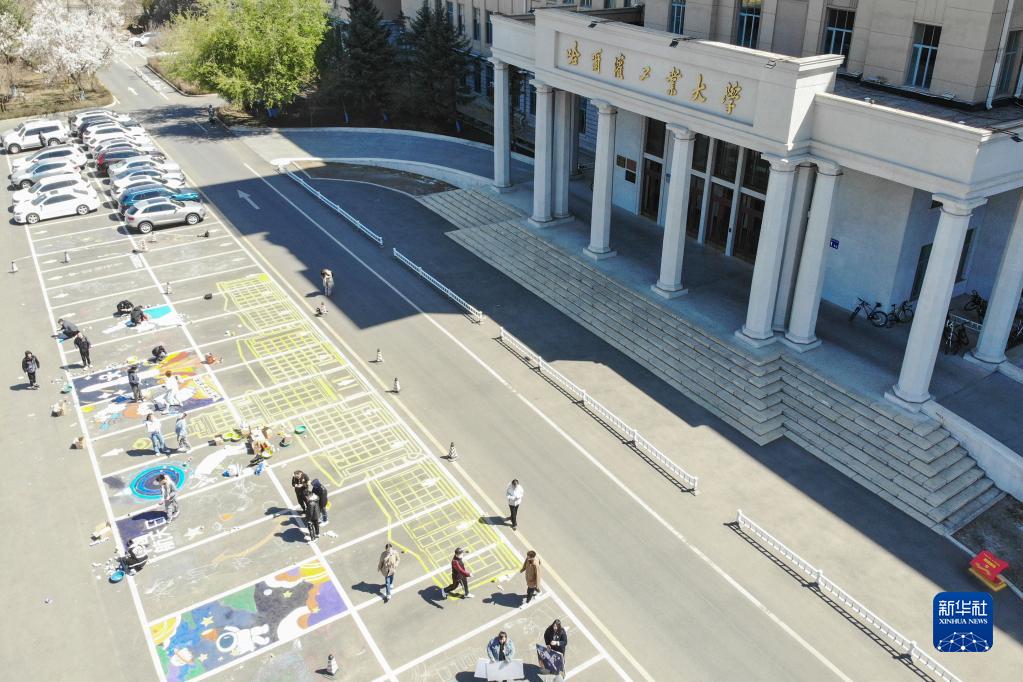 4月22日,在哈尔滨工业大学校园,学生在进行航天主题的大地彩绘(无人机照片)。