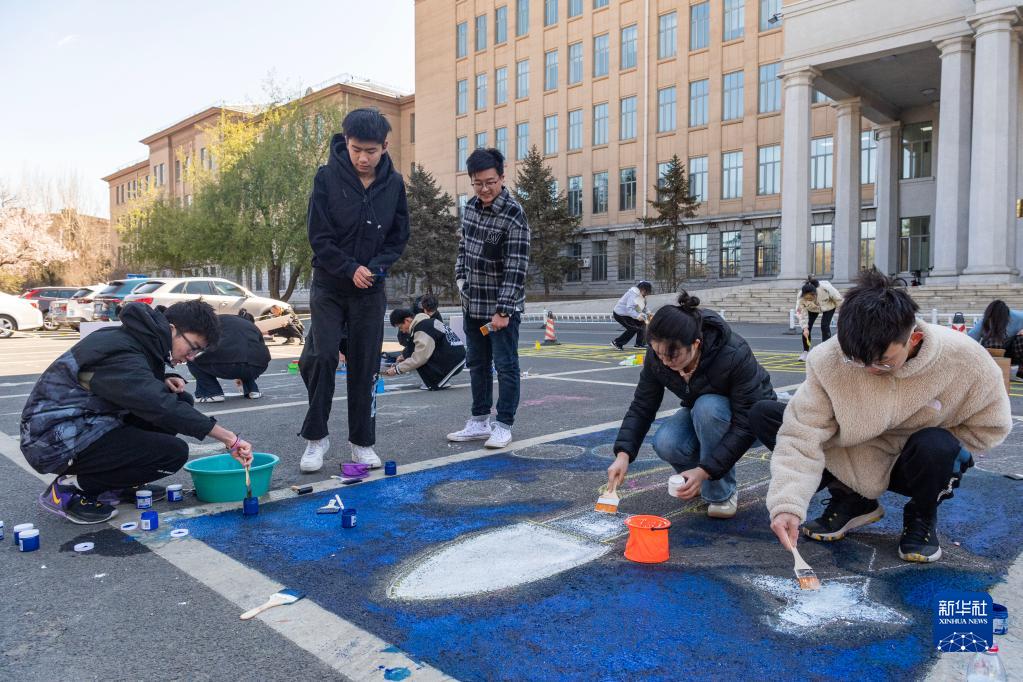 4月22日,在哈尔滨工业大学校园,学生在进行航天主题的大地彩绘。