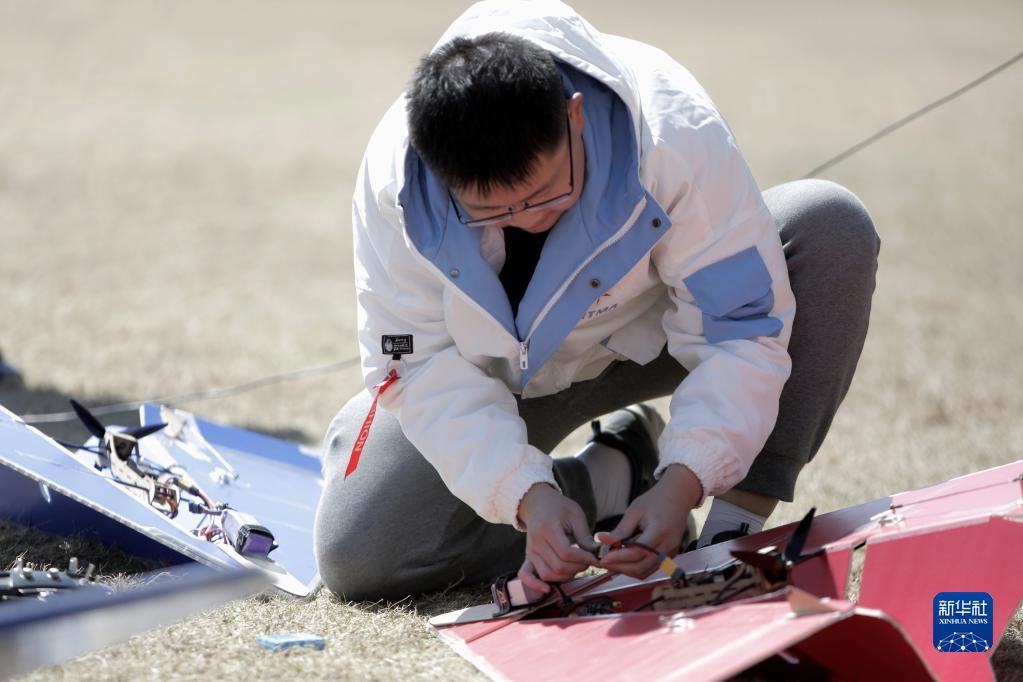 4月22日,在哈尔滨工业大学体育场,航模协会的学生在航模飞行表演前进行调试。