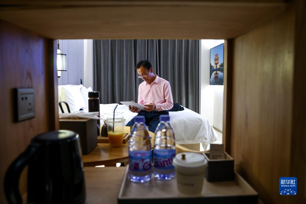 4月11日,朱彦军在北京一家宾馆浏览参加节目录制的受访提纲。第二天,他将受邀参加中国教育电视台《育见》栏目关于“世界读书日”系列访谈的录制。新华社记者 刘金海 摄