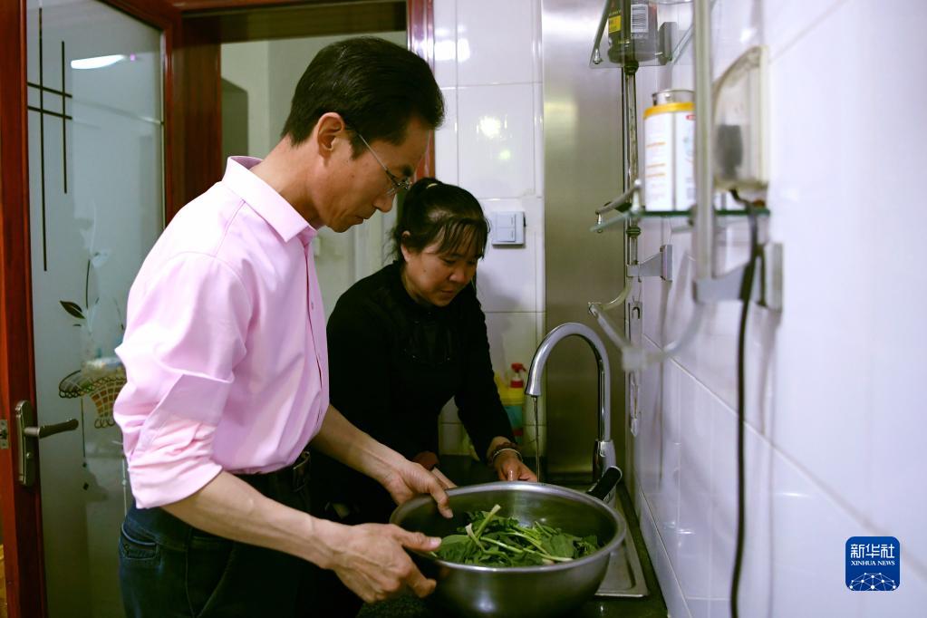 下班后朱彦军和妻子在家里做饭(4月10日摄)。新华社记者 方欣 摄