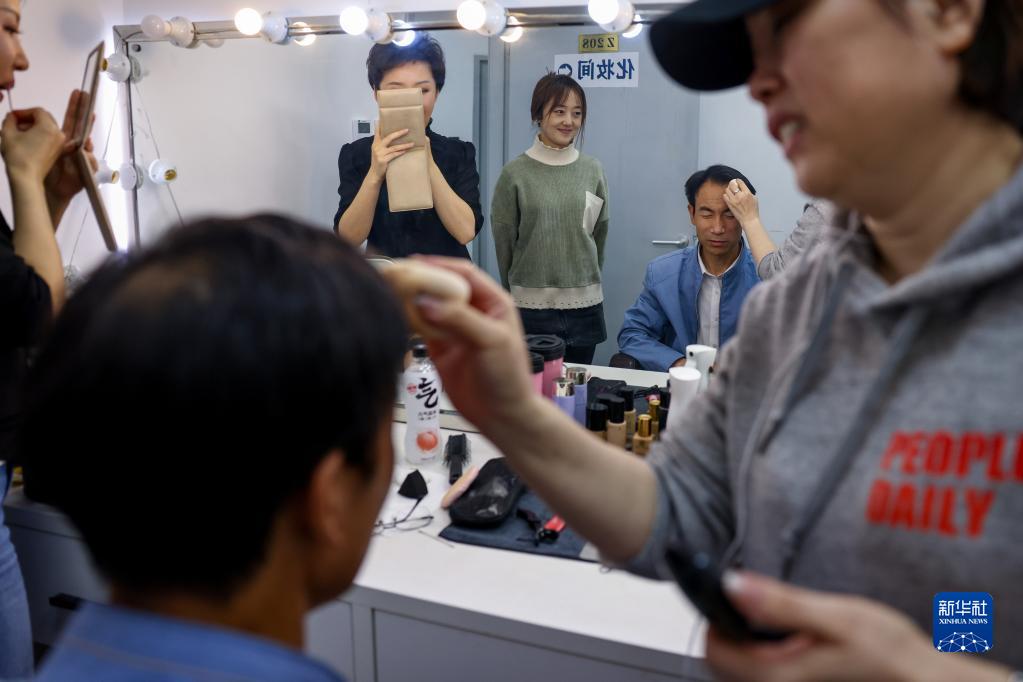 4月12日,在中国教育电视台一处化妆间,化妆师为朱彦军(右二)化妆。“头发有点长,得整整”,朱彦军憨厚地说。新华社记者 刘金海 摄