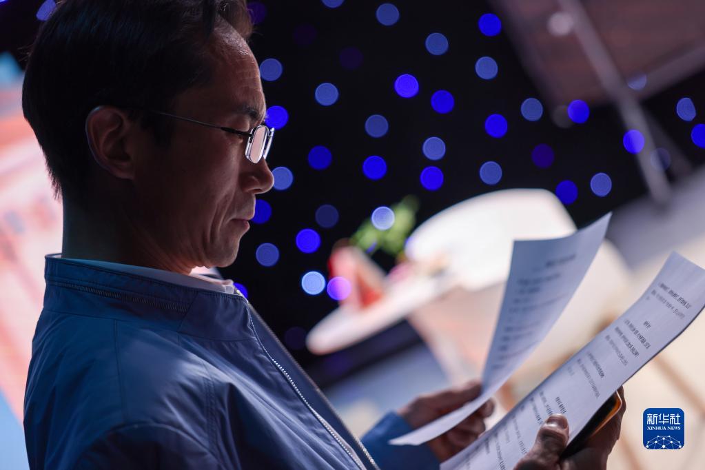 4月12日,在中国教育电视台一处演播室,朱彦军在节目录制前进行最后的准备。新华社记者 刘金海 摄
