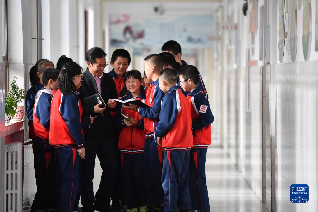 朱彦军在静宁县城关小学和孩子们交流阅读心得(4月10日摄)。新华社记者 陈斌 摄