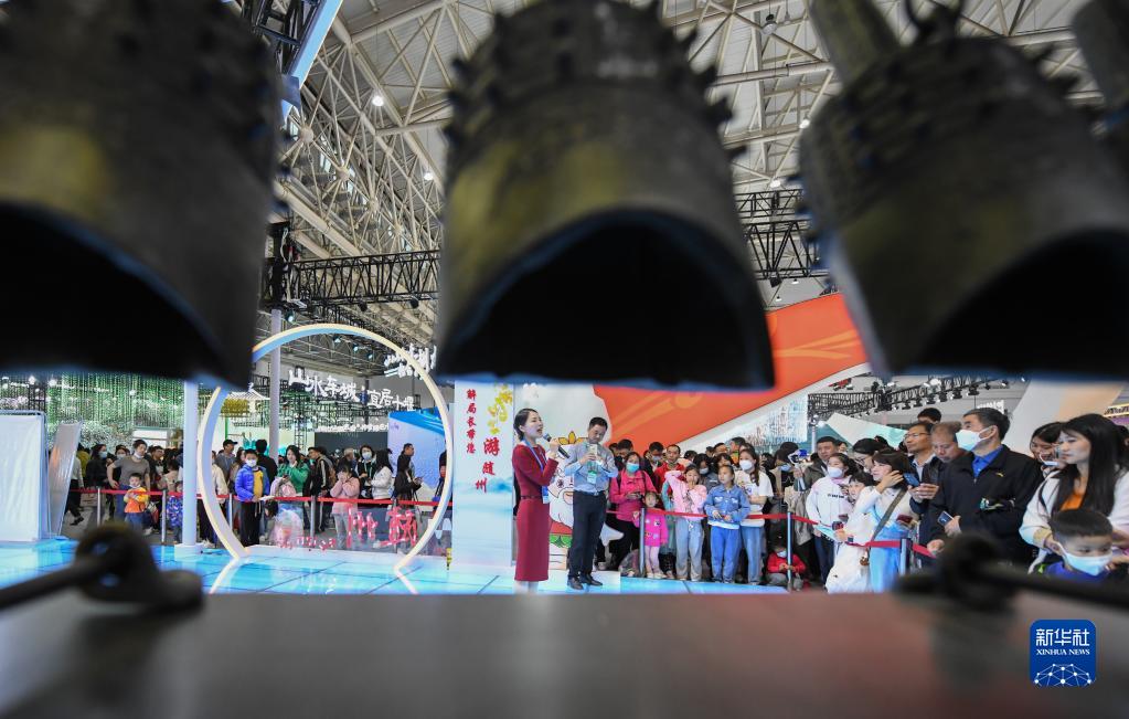 4月22日,湖北省随州馆工作人员向观众介绍编钟文化。