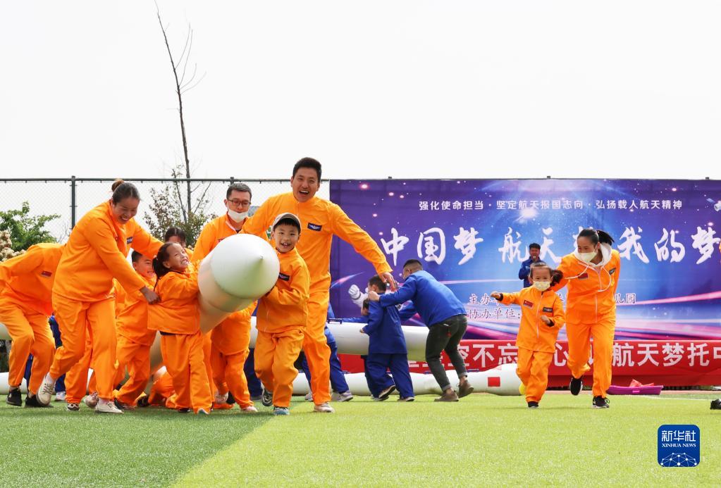 4月22日,在江苏省连云港市海州区体育场,小朋友和家长参加航天主题亲子游戏。