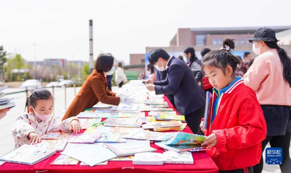 4月22日,市民在吉林省图书馆前的“换书大集”挑选图书。