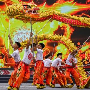 4月22日,在中国—东盟(南宁)非物质文化遗产周开幕现场,演员在表演舞龙。