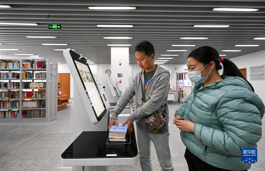 4月21日,在天津市河西区文化中心,读者在区文化中心图书馆进行图书通借通还。
