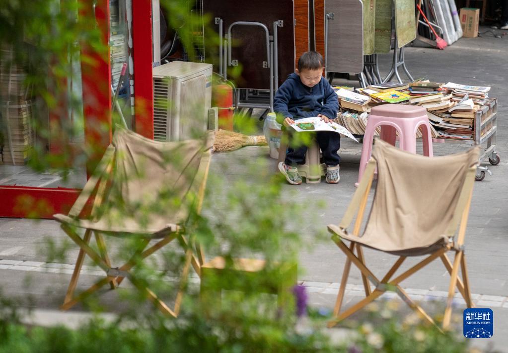 4月22日,一名小朋友在南京市一家二手书摊读书。