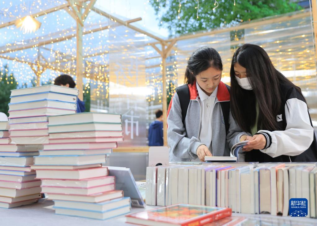 4月21日,在浙江省湖州市安吉县图书馆广场上,市民在“书香吉市”的线下书展上阅读、挑选书籍。