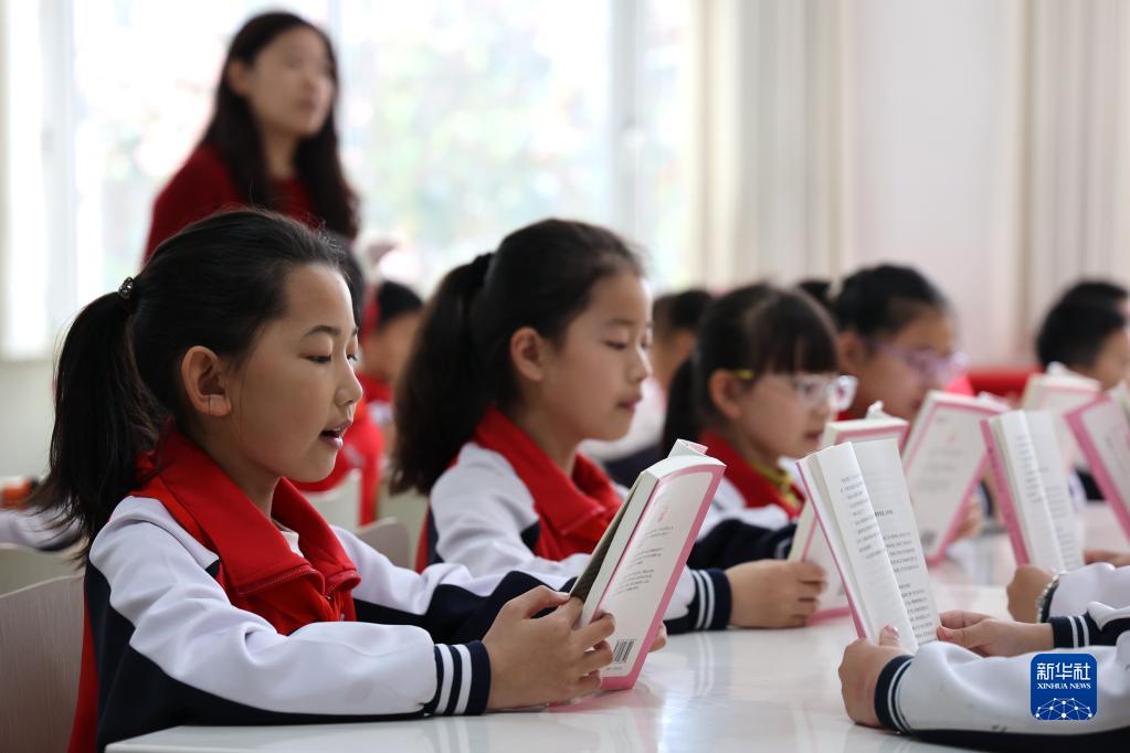 4月21日,山东省滨州市渤海中学南校区的学生在老师带领下阅读书籍。