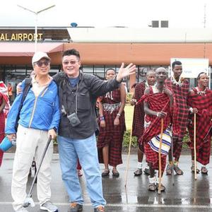 4月22日,在坦桑尼亚乞力马扎罗国际机场,中国游客与身着坦桑尼亚传统服饰的当地人合影。