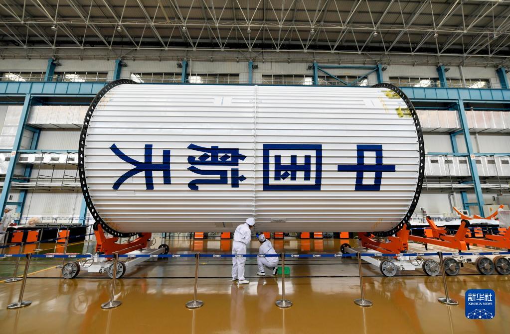 在航天科技集团一院天津火箭公司总装测试车间,装配一组班组成员在进行火箭装配(4月19日摄)。