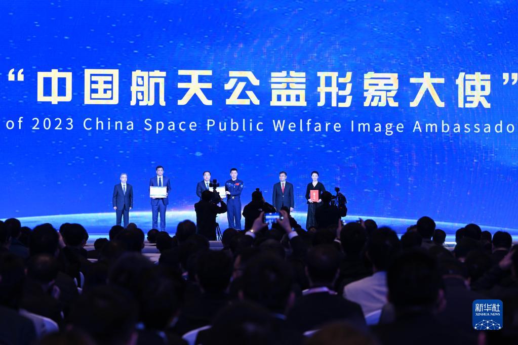 4月24日,航天员陈冬(右三)、中国科学院院士王赤(左二)、黄梅戏表演艺术家韩再芬(右一)被授予2023年“中国航天公益形象大使”称号。